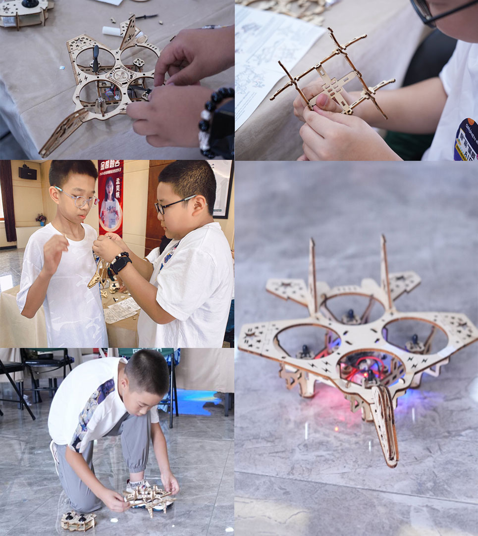 在创客空间的原木香气中,孩子们化身「小小工程师」,没有螺丝刀的轰鸣,没有电路板的复杂接驳,孩子们仅凭双手的触感,便能让机身框架在掌心层层叠起,机翼的弧度模拟候鸟展翅的力学结构,尾翼的平衡杆暗藏杠杆原理,连遥控器的握柄都经精准设计后直接拼装成贴合掌心的温润弧度,既显模块化科技的利落,又延续着手工温度里的人文质感,仿佛传承着匠人对手工温度的执念,更是对「科技与人文共生」的诠释。镜头里定格的不仅是翱翔的无人机,更是孩子眼中闪烁的光芒,是孩子展翅的未来。